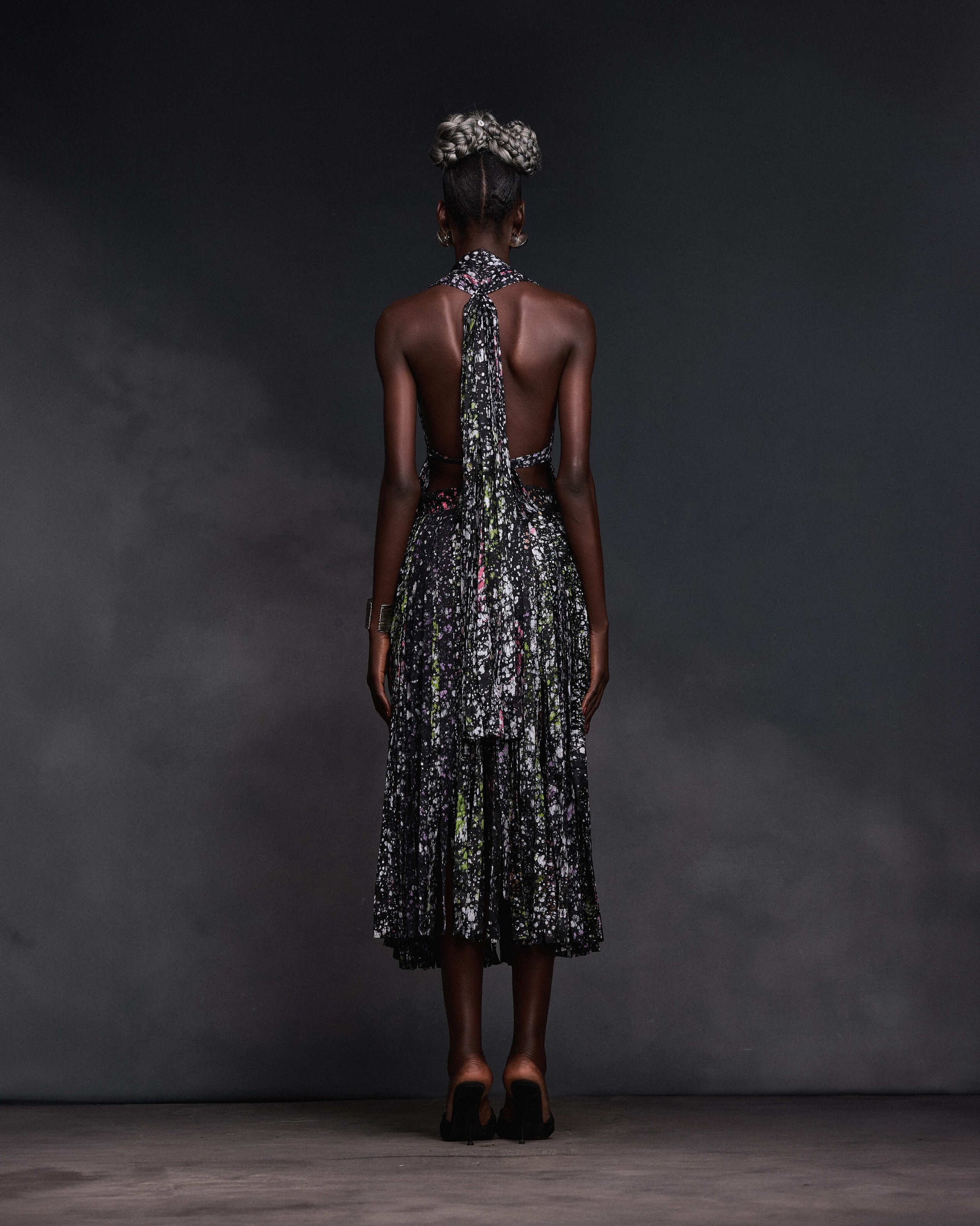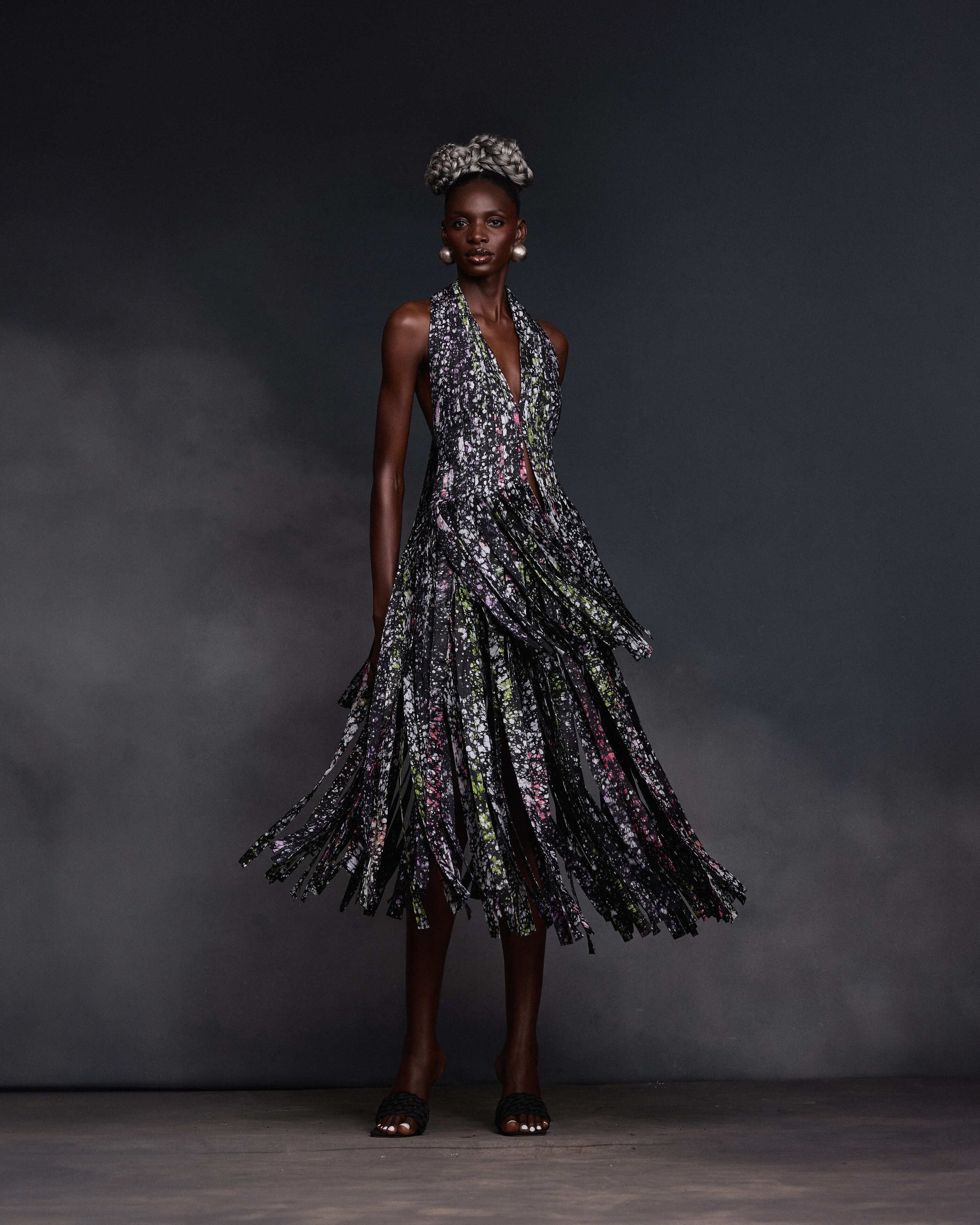 This piece showcases sleek vertical stripes that elongate the body and enhance the silhouette. Its most captivating detail is the flowing fringe that drapes from the waist  and trails along the front and back, adding graceful movement and effortless drama with every step.